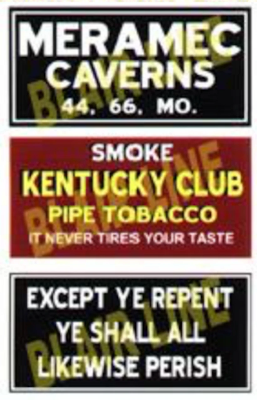 Another version of the Midwest classic Meramec Caverns. Kentucky Club tobacco and “Repent or perish” HO scale signs approx. size = 2 3/8″ x 1 1/8″Â They still stand, the painted barn and wall signs of yesterday. Some have been repainted…renewed. And some are in an advanced state of decay. And sadly many are gone. A once common method of advertising is slowly slipping away as are the barns and old buildings the signs were painted on. We are offering water transfer decal reproductions of old barn and wall sign decals. Use them on your barns, building walls or as a billboard. Each set comes with three signs as shown.