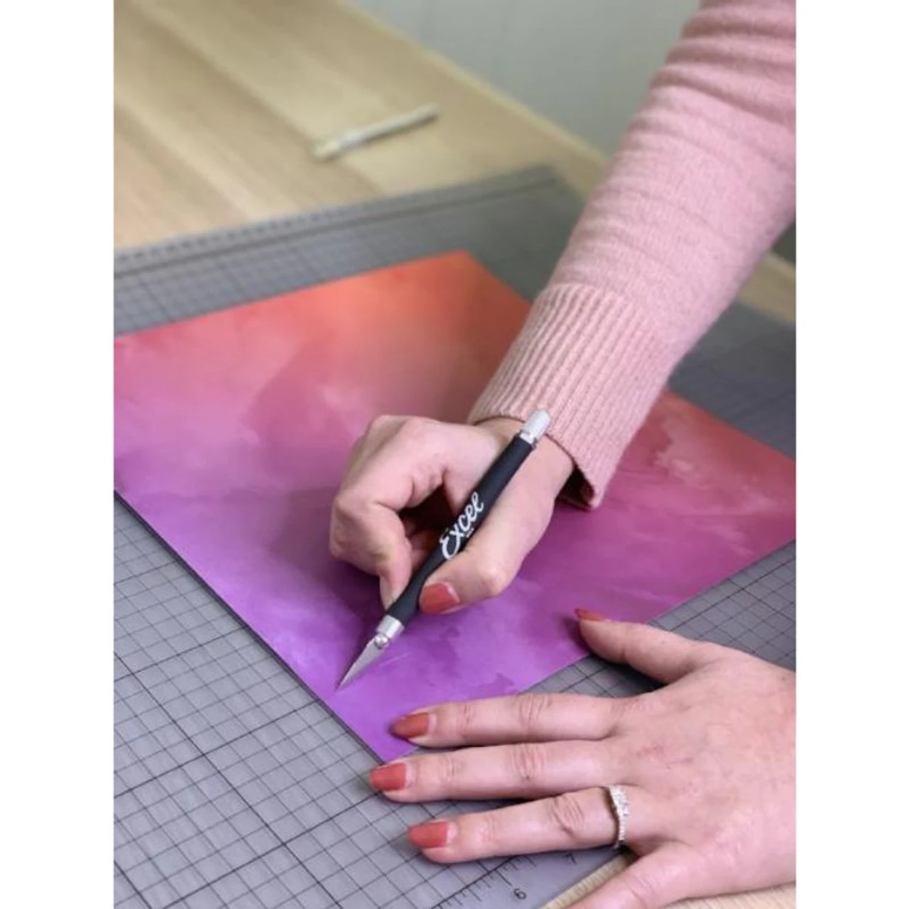 Excel Blades -Â K18 Grip-on Knife 16018 Excel Blades’ favorite paper cutter! K18 Cushion grip knife comes with #11 double honed blade Precision knife with special screw for extra blade security and stabilization Used for: precision paper cutting, trimming card-stock and rubber, stripping of paper Use with:Â foam, plastic, wood, cloth, film, polymer clay, cork, clay carving, pumpkin carving. Used by: graphic artists, designers, hobbyists, scrapbook artists and crafters Grip-On Knife fits with Excel Blades #5, #6, #10, #11, #12, #13, #16, #17, #17A and #21. .375 x 5 in – .9 x 12.7 cm Made in the USA COLOR MAY VARY