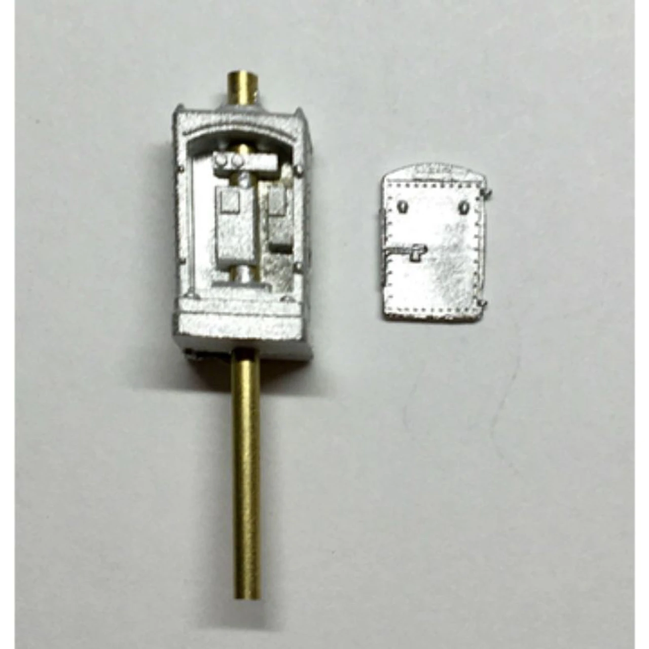 Our three inch 1/16″ tube, sold separately, fits down inside this larger daimeter (5/64″ OD, 0.066 ID) non-removable tube inside the cabinet. This makes a nice flange at the top of the cabinet. We sell these cabinets like this so that if you want a taller mast, it will accomdate any length. Showcase Miniatures HO Scale US & S Single Door Cabinet