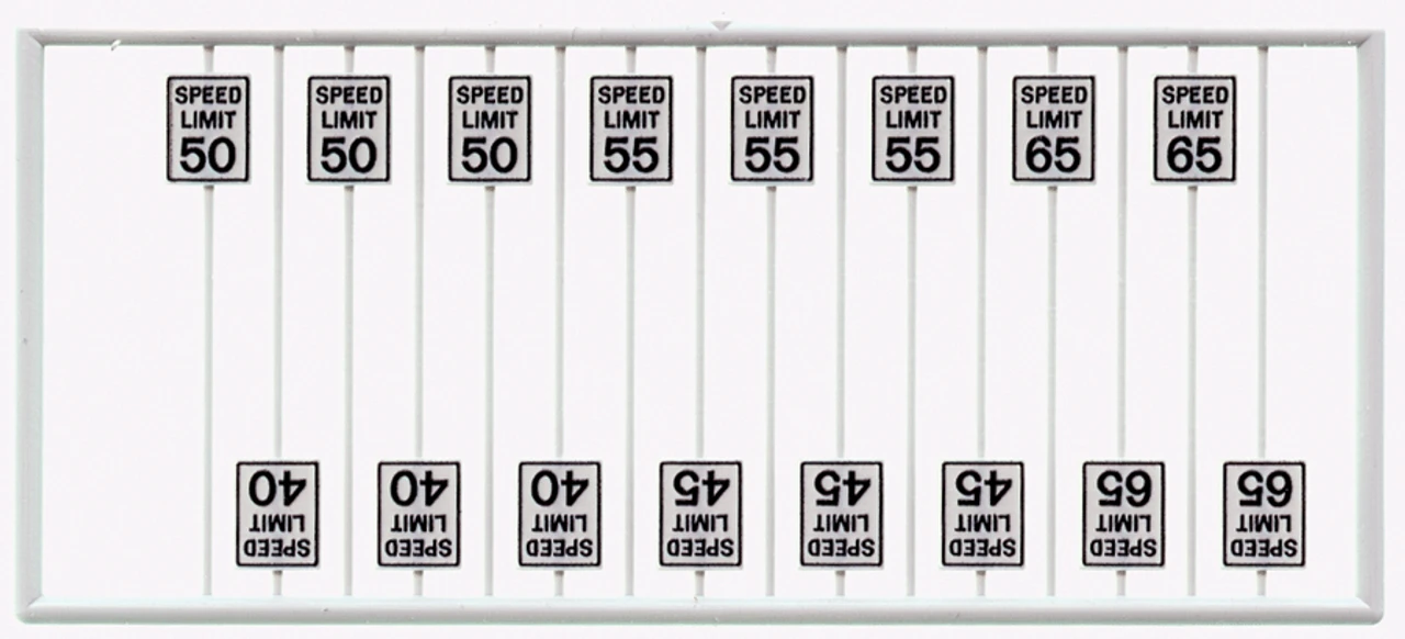 These are speed limit signs. 3 each of 40, 45, 50, and 55 MPH. 4 each of 65 MPH They are molded in off white styrene with black printing.
