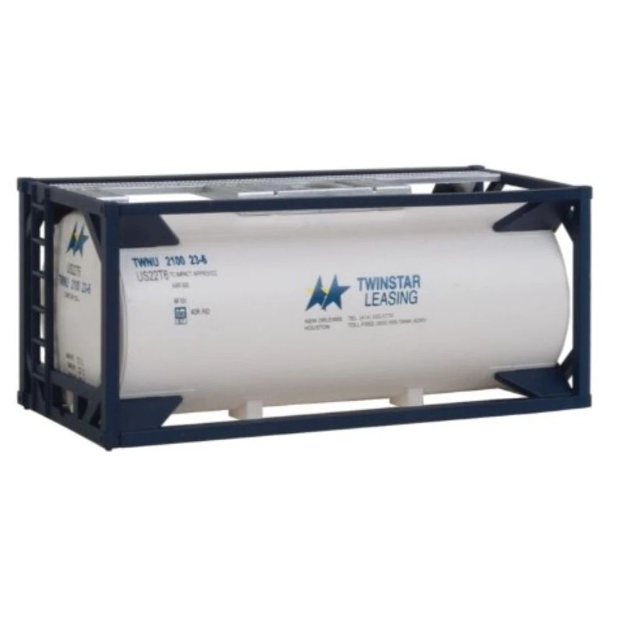 Product Information * Prepainted & lettered * Easy assembly * Realistic loads for WalthersProto(R), WalthersMainline(R) & other well cars * Great detail for terminals, highways and industrial scenes Walthers HO Scale 20′ Tank Container Twinstar Leasing