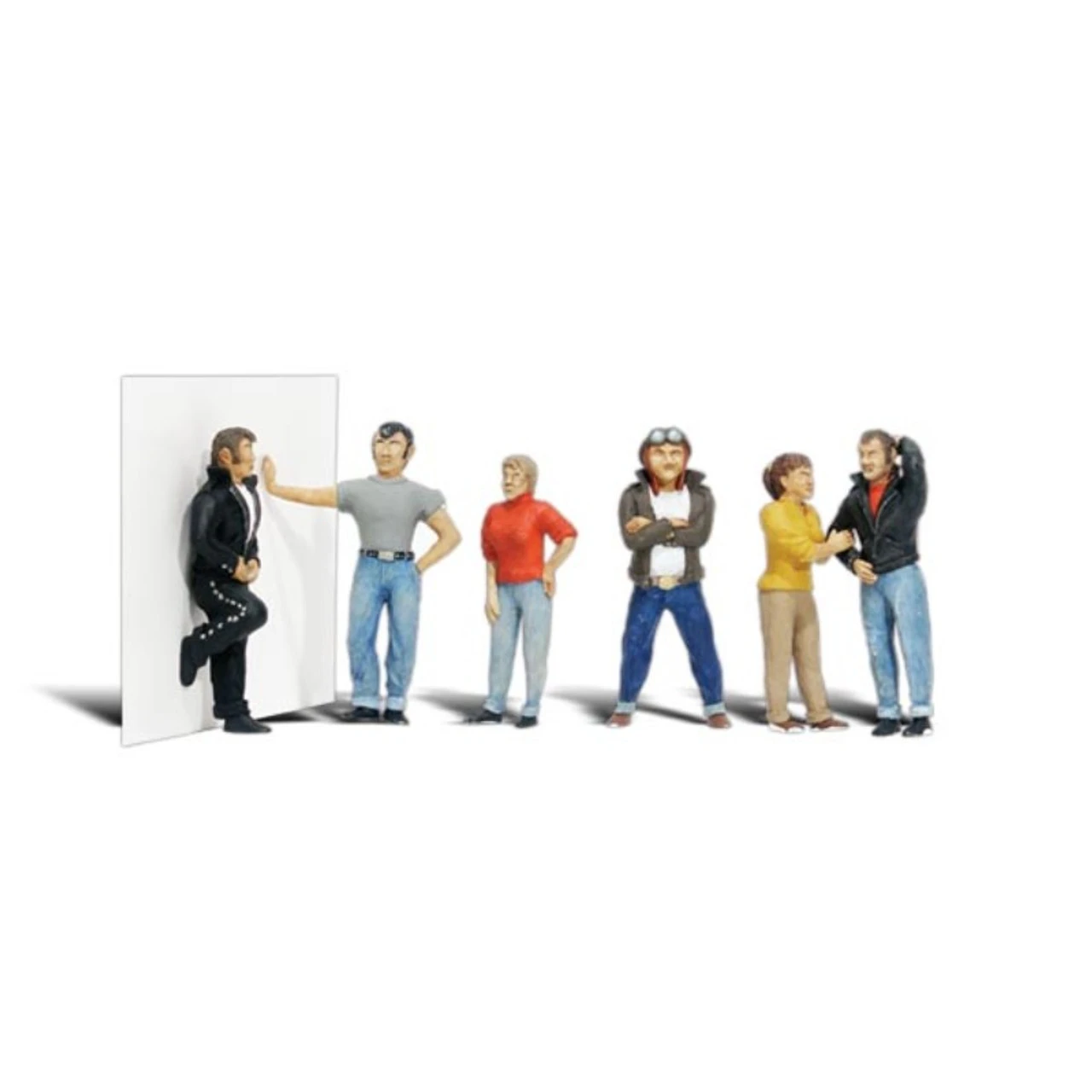 A cool couple stands together, arms entwined, while the man fixes his hair. Another couple stands together: his arms are crossed and her hand rests on her hip. One man leans with his hand on the wall. Another man adjusts his leather jacket. Set contains 6 pieces. Colors may vary from actual product. Complete your scene and bring it to life with affordable works of art in HO scale. Sculpted in fine detail and hand-painted, they add color, humor and interest to any layout. Scenic Accents figures have a natural charm and a realistic appearance that steal the show! Economy packages also available in HO scale. Attach with Scenic Accents Glue and position with Gentle Grips®.