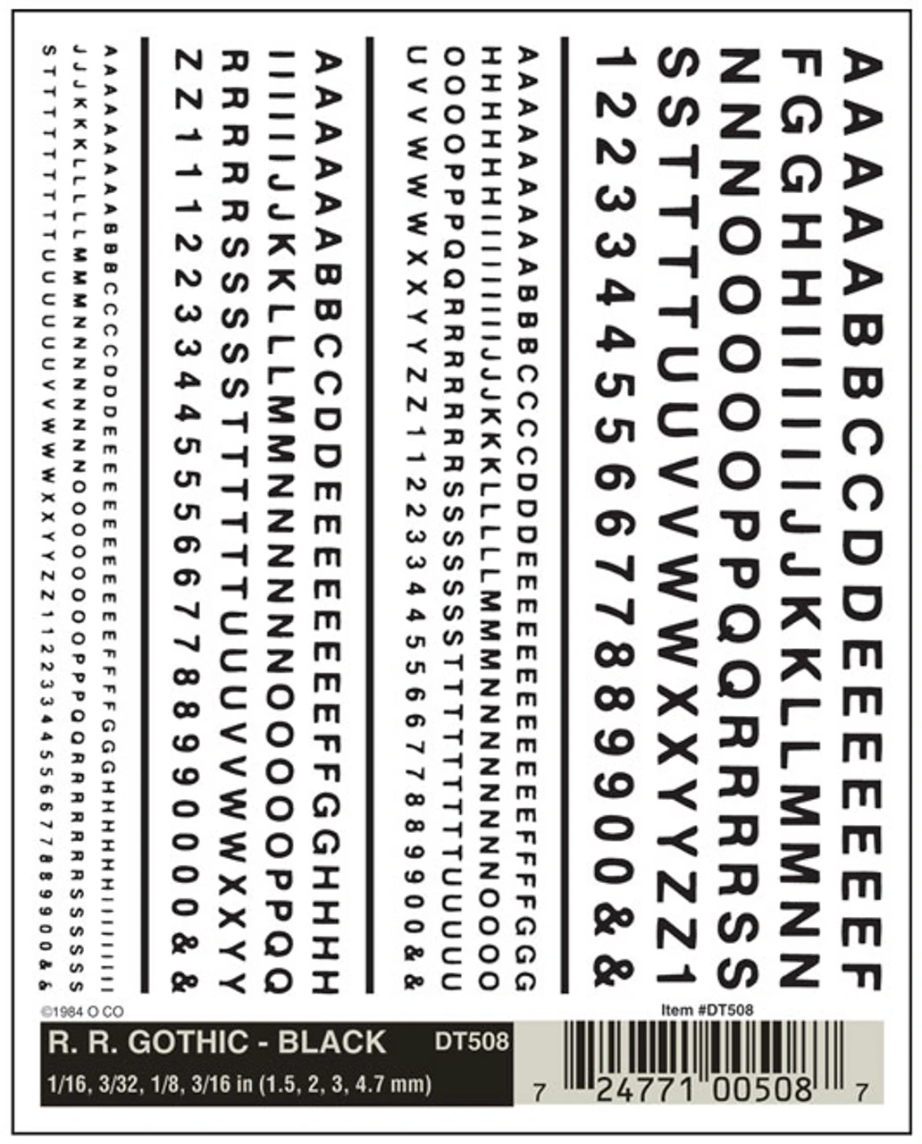 RR Gothic Black DT508 Font sizes 1/16″, 3/32″, 1/8″, 3/16″ (1.5 mm, 2.3 mm, 3.1 mm, 4.7 mm) One sheet 4″ x 5″ (10.1 cm x 12.7 cm)